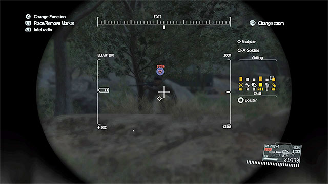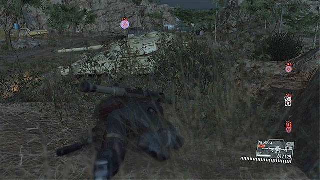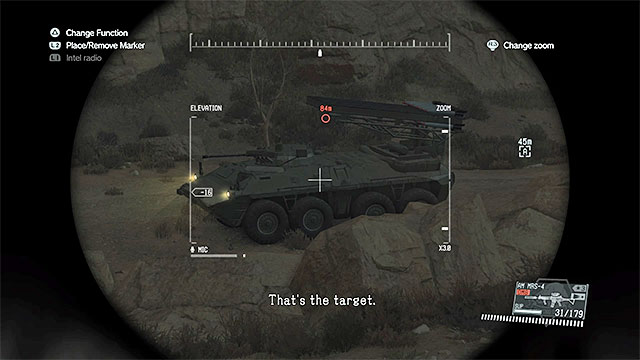 Description: Search the area to the north-east from guard post number 11. Be careful, because there is a sniper among your enemies. Try to locate this opponent using binoculars and get rid of him quietly. Only after you do that, sneak up to the APC and Fulton it or plant C4 on it. At the end, eliminate the four soldiers. You can attack them from distance, use an explosive or sneak up to them from behind and knock them out one by one (the most risky method).