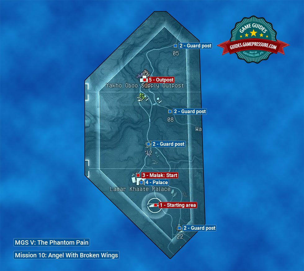 The above map presents the area of the tenth main mission of Metal Gear Solid V - Angel With Broken Wings. All in all, there only are two important locations on the map - Lamar Khaate Palace where you find Malak at the beginning of the mission (point 3 on the map) and Yakho Oboo Supply Outpost, where he is transferred later into the mission (point 5 on the map). It is worthwhile to make a longer stop in the palace and rescue the prisoners there, before they are shot (point 4 on the map).
