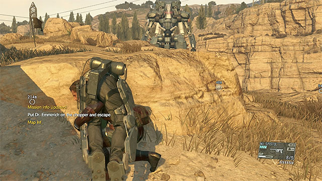 As soon as Sahelanthropus ends its initial fire, start running towards the landing zone, while trying to keep close to the rocks. After you approach your destination, hide behind the rocks, because most probably, Metal Gear will dispatch several drones your way. Stay behind the cover for as long as the drones keep scanning the area around you. Only when it gets safe, run towards the chopper and put Emmerich inside.