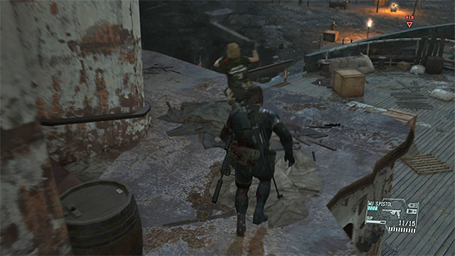 The option described above is not the best one since it may result in raising the alarm in the entire village and at the same time other children will open fire at you. You shall try to attack White Mamba undetected instead or even use a sniper rifle which may use the sleep ammunition (like the RENOV-ICKX TP). In this case you just need to stay in a place from which you may see White Mamba (like the one shown on the screenshot above) and fire at him. You may also climb on a box which is behind him and fire at his back with a sleep ammo from a pistol . Both these ways will allow you to complete an optional task.
