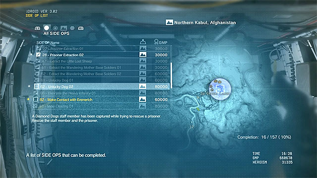 Side-Ops in MGS V are a good and stable source of income. This is so, because there are more than 150 of them in the game and you can earn, as much as, several thousand GMP from each. An additional incentive is the fact that side missions are usually very short (e.g. finding a blueprint or saving a single prisoner), thanks to which they are not too time-consuming.