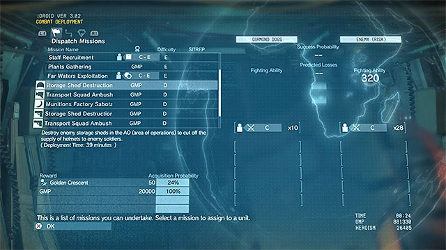 Later into the main campaign in MGS V, you also receive an option to dispatch your men on missions. Rewards for these vary, but you often earn more money for them. Therefore, try to have some of your men in the field, at all times, especially since the game does not make you follow their progress. If a mission is successful or fails, depends on the percentage coefficient for completing that mission. To learn more about this element of the game, see the other guide, in the chapter devoted to management of the Mother Base.