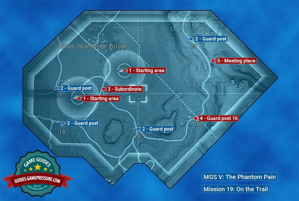 The map above shows the area available during the nineteenth mission in Metal Gear Solid V entitled On the Trail. Select any landing (they are close to each other). You can play the mission on two different ways. You either start following the Major's subordinate (number 3 on the map), who will visit the bigger guard post (number 4 on the map), or head straight to where the Major is (no. 5) and try to knock him out or kill him.