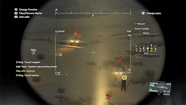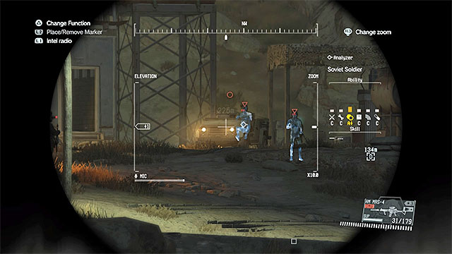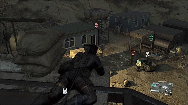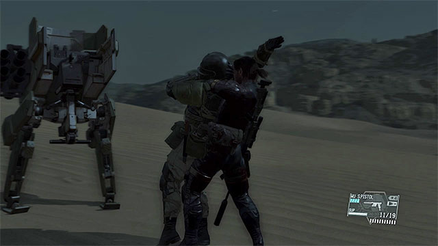 By default, the search team is located on the desert. It consists of four soldiers with Walker Gears trying to find the CIA agent. You can neutralize the enemies before they find him, using a sniper rifle with non-lethal ammunition and aiming for the heads (a better option), or by sneaking up to them from behind and throwing the operators off the machines. Try not to alarm the opponents, because during the fight, people who you've already knocked out and are waiting to be Fultoned may be killed.