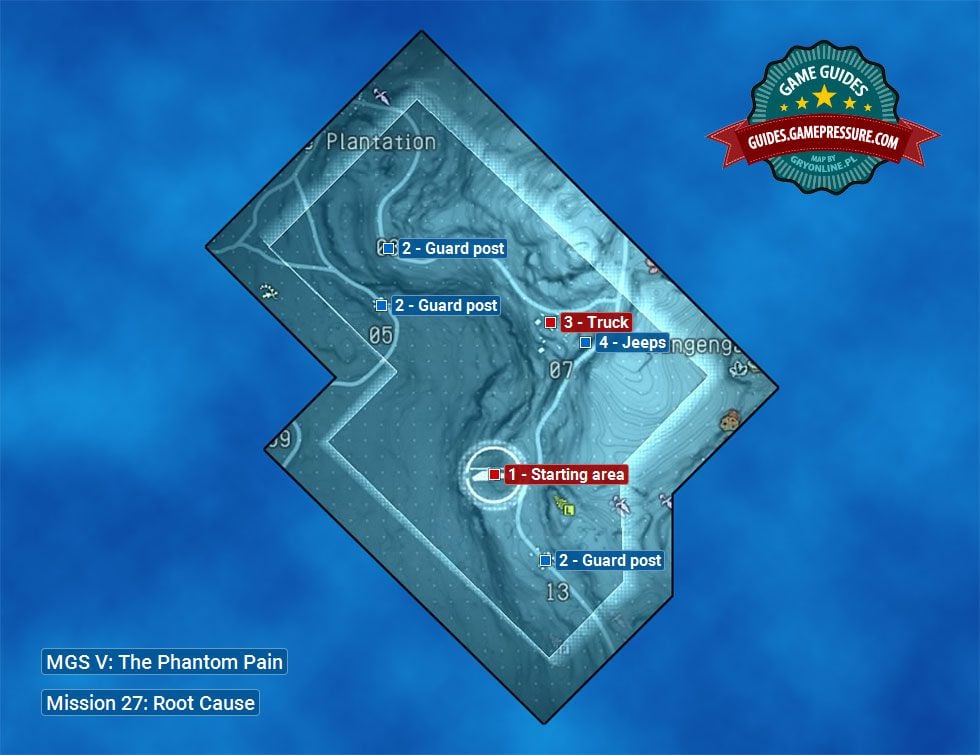 The map above shows the area available to you during the twenty-seventh mission in Metal Gear Solid V entitled Root Cause. After starting the mission, you should head towards the truck parked at guard post number 07 (number 3 on the map), because the main target will try to use it to escaping. You can use the truck (with the rescued Intel Team Member) to leave the mission area, or you can take one of the jeeps parked nearby (number 4).