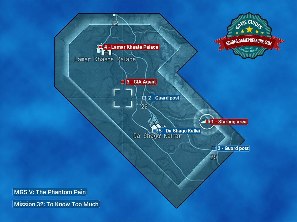 The map above shows the area available to you when playing the thirty-second main mission in Metal Gear Solid V, entitled To Know Too Much. Right after you start the mission, you should head to the place shown by the game (number 3 on the map). It is the location of the CIA agent. If you fail to rescue the target in time, he will be transported to Lamar Khaate Palace (number 4) and it will be more difficult for you to free him from there. There are several optional objectives to complete in the palace. Moreover, you can visit Da Shago Kallai (number 5 on the map), where you will find one of the other prisoners (do it before you exfiltrate the CIA agent, because later the mission area will get smaller!).