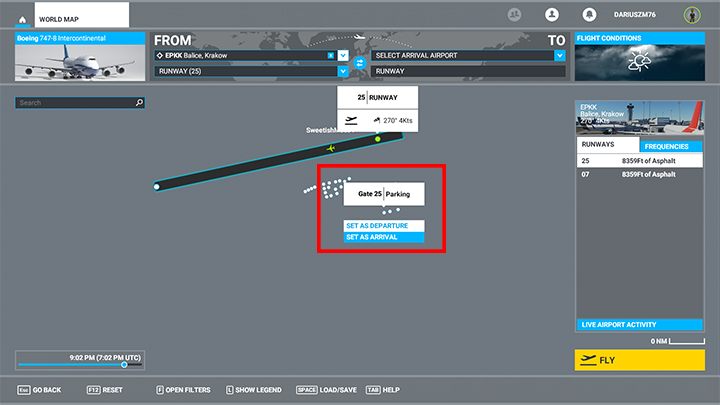 The next step is the destination airport - click on it and choose it as the destination point - Set as Arrival. For a start, it is not worth exaggerating distances. Therefore choose one that does not require many hours of flight, but rather several or several dozens of minutes. In our example we have selected the EPWA airport in Warsaw on a flight from EPKK in Cracow.