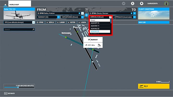 A brand new green route has appeared leading to one of the runways. Note that once you choose one of the STAR arrival options, the plane's route will become much longer, as it usually means circling the city and the airport to finally approach from the right side. Try to choose one that will require as little circling above the city as possible.