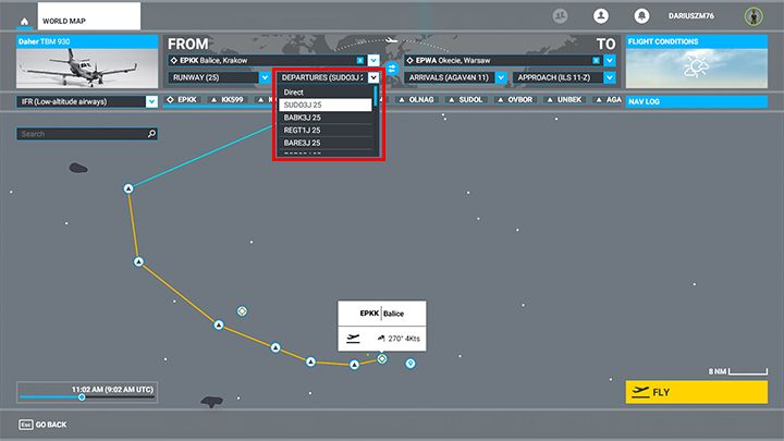 You can still choose a similar procedure for the initial airport, that is, the SID (Standard Instrument Departure). It establishes a route to safely leave the airport's airspace and enter the proper air route. In the game, you don't have to worry about possible collisions and the air traffic over the airport, so the SID procedure is especially useful in case of airports located in difficult terrain, such as in the vicinity of a high peak. In other cases, it will certainly improve immersion and realism. Choose one of the departures menu options, preferably one that will continue on a similar course after take-off from the runway.