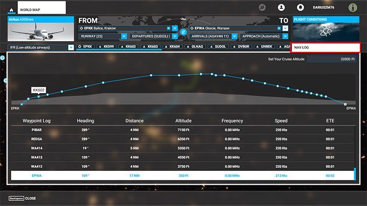 We should designate the airway that we will use, the proper procedures, SID and STAR checkpoints, and the proper descent path to the runway of our destination airport. This will allow us to efficiently fly a large passenger plane at night and in very bad weather, when you can barely see anything from the aircraft's cockpit. With a good flight plan, you will be able to complete the entire journey according to the instruments and gauge indicators available in the cockpit. Fortunately, in Microsoft Flight Simulator 2020, such a flight plan can be created automatically after a few clicks.