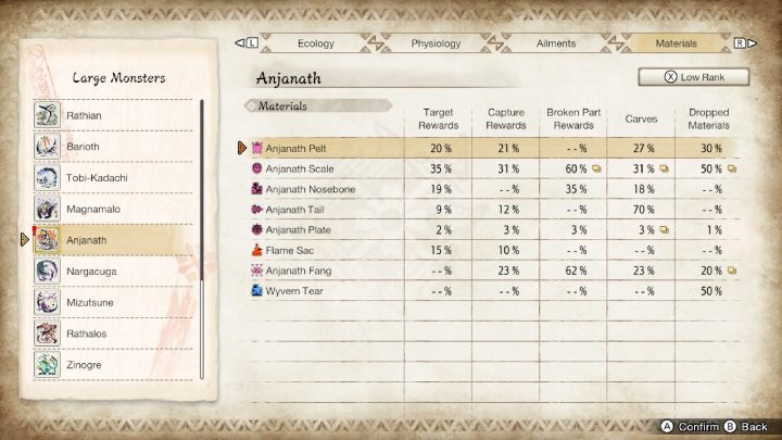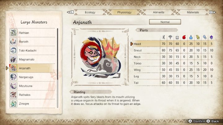 The following page of the guide to Monster Hunter Rise contains the most important information about the monster Anjanath. You will learn about its weak spots and elemental vulnerabilities. At the very end, we presented a list of rewards for defeating Anjanath and some tips for fighting this monster.