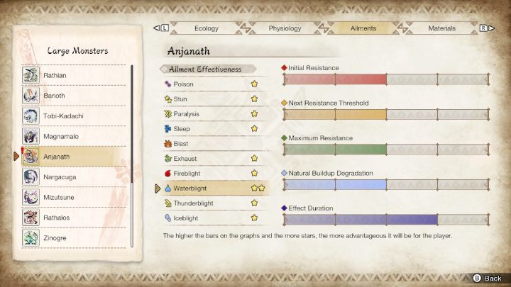 The above image lists all the parts of the monster's body and their susceptibility to particular weapon types and elements. The higher the number, the more damage is dealt.