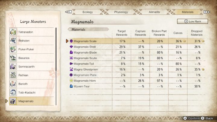 Above you will find a list of all the usual and rare items that you can get by fighting this monster. Some of them are necessary to make particular weapons or armor.