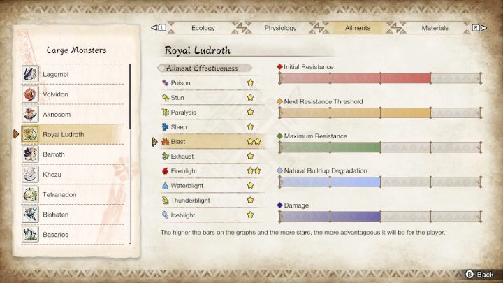 The above image lists all the parts of the monster's body and their susceptibility to particular weapon types and elements. The higher the number, the more damage is dealt.