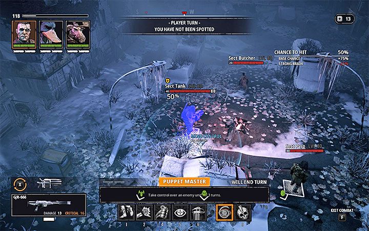 A safer option - get Magnus close to the Sect Tank and use the Puppeteer skill on this enemy. If this action succeeds, then support the Sect Tank from behind the nearby covers. You can use the Sect Tank to attack the Shaman described below or just stand in the open air so that, apart from shooting, your temporary ally is also attacked by other enemies (this will make him very weak or even dead after the skill ends).