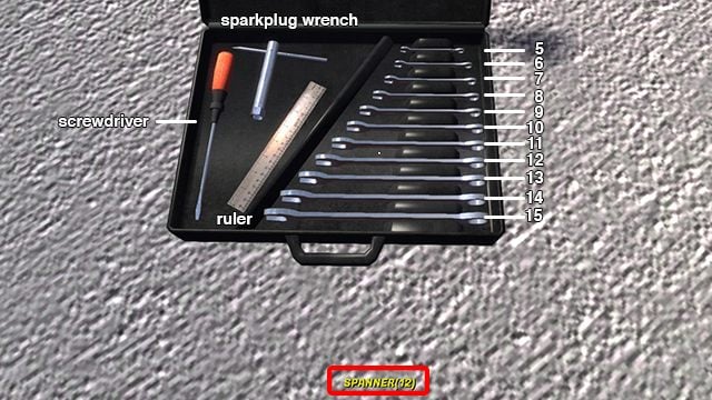 In the Spanner set, you will find size 5-15 wrenches, a screwdriver, a sparkplug wrench and a ruler.