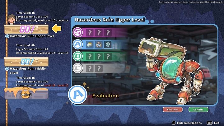 Each level consists of three layers, the last of which is small and involves defeating a miniboss. The locations are corridor-based and you can preview their layout on the map at any time. Red dots signal the location of enemies, so you can always prepare for a potential battle. The opponents mostly consist of old robots that don't pose much of a threat, especially if your character's level matches the area's recommendations.