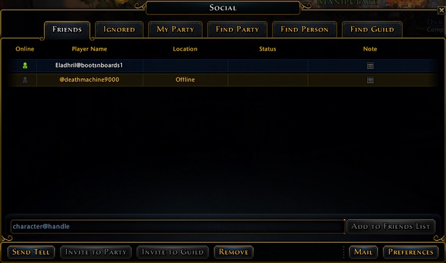 Social window (hotkey "O") is the center of social aspects of the game, here you have list of your friends, you can find other players or groups. Social window tabs are: