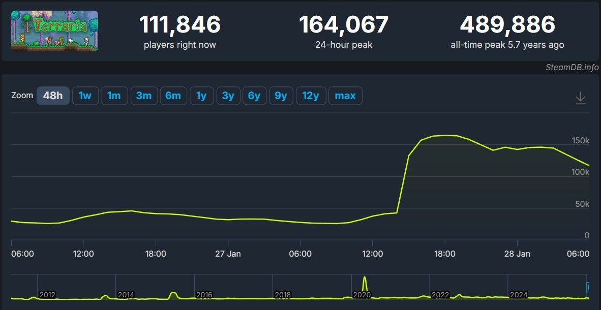 The release of the new update has led to a surge of players returning to Terraria. At its peak, over the past 24 hours, more than 164,000 people were playing the game simultaneously on Steam alone. While this frenzy isn't as large as the release of version 1.4 (which saw a record of nearly 490,000), the result is still impressive—especially for a game that's nearly 15 years old.