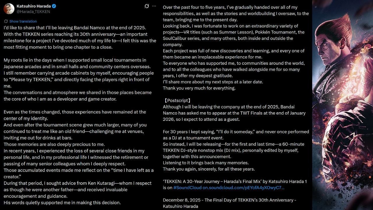Katsuhiro Harada announces his departure from Bandai Namco after 30 years working on the Tekken series. But this may not be the end of a legendary career.