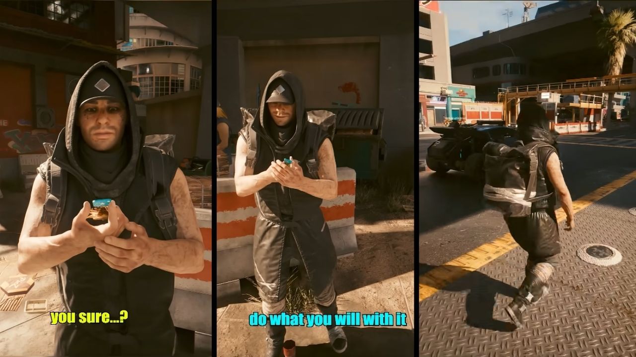 The NPC takes the gift and begins to walk away.Cyberpunk 2077, Developer: CD Projekt Red, screenshots from a video by Broken_Player