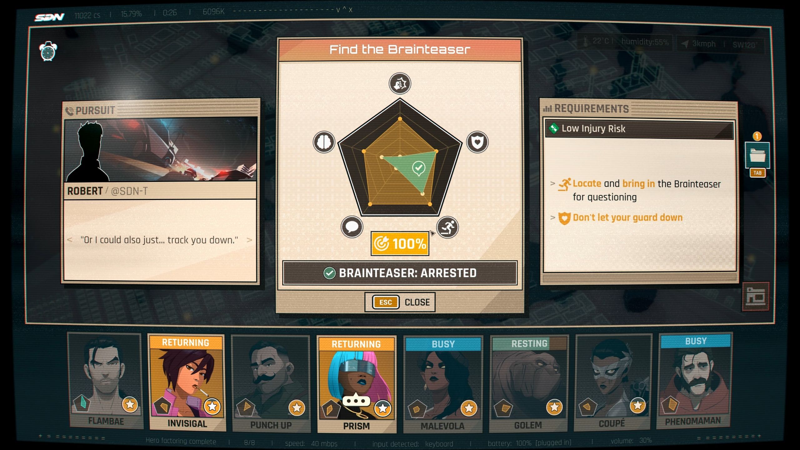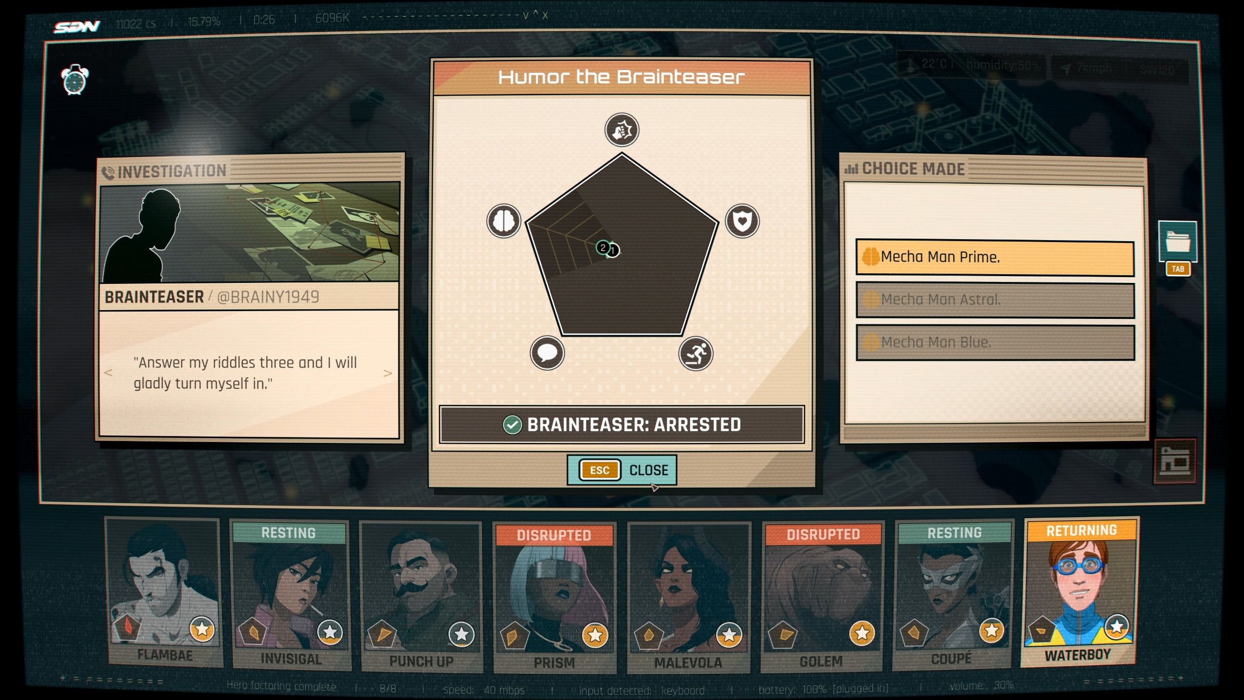 Dispatch lets us dive into the world of superheroes and villains but we can see it from a different side, not so glamorous. We need to work hard to stay in it, as at the beginning our “superpower” is taken from us. Of course, the plot is extremally important in the game, and story driven decisions, like who to cut, can be really difficult. However, it goes hand in hand with investigations – you are a dispatcher after all. Some of them, like choosing who to put on the team, are really tricky. Brainteaser is also quite problematic. Let’s learn how to answer his questions.