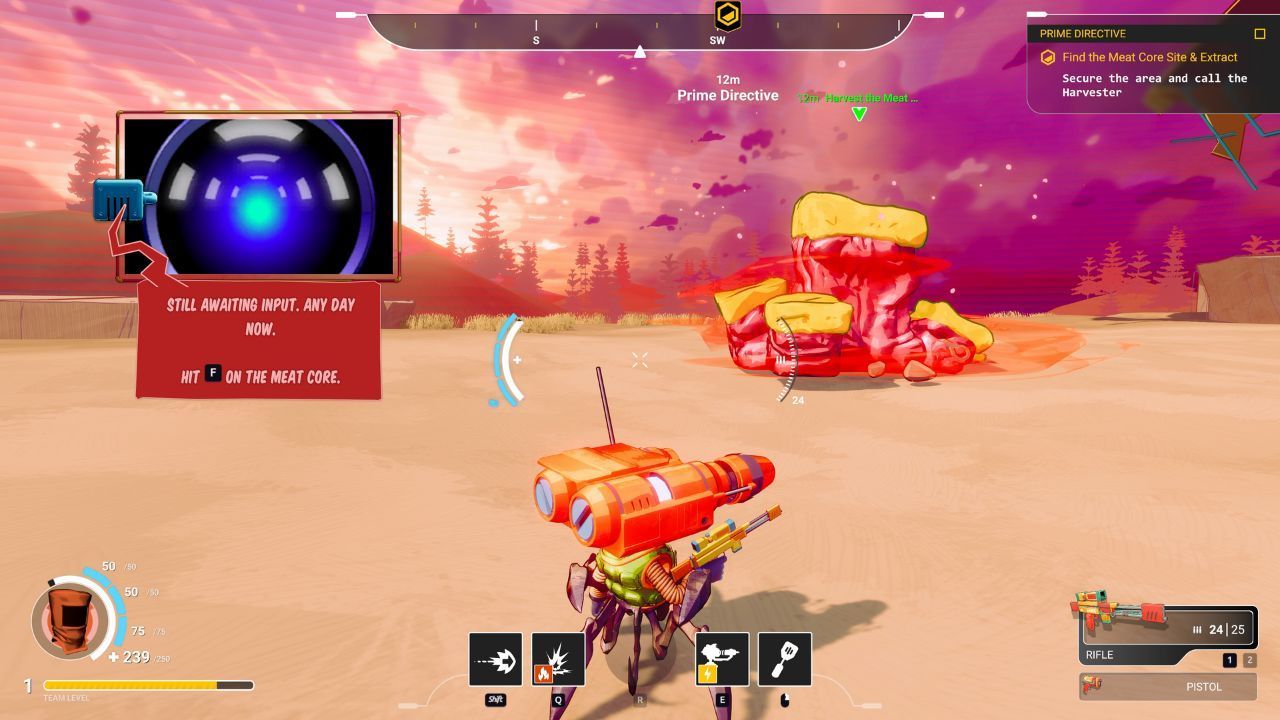 First act: you land on a planet. You have to extract its meat core, because planets have meat cores. Everyone knows. It's just meat science. Every one of the planets has meat in it. And then you use that to eventually find the first boss, and then you defeat the first boss to figure out how to get to the next planet or have the fuel to get to the next planet.