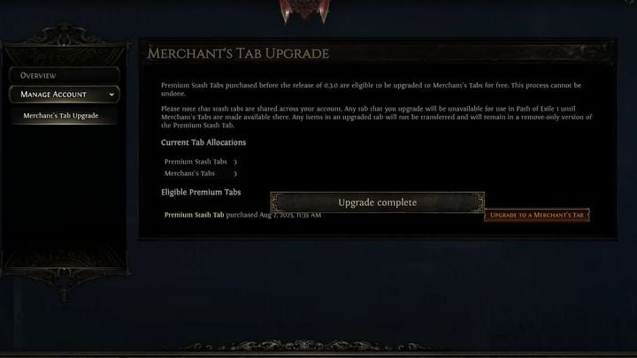 With the update now live, Grinding Gear Games allows players to convert their existing Premium Stash Tabs into Merchant Tabs for free. Sounds great, right? Well, there’s a catch. And I don’t just mean the fact that only Premium Tabs purchased before August 29 (the day the patch dropped) can be converted. Any Premium Tabs bought after the update aren’t eligible for conversion at all.