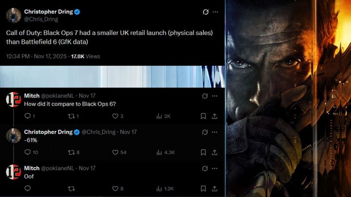According to Dring, “Call of Duty: Black Ops 7 had a smaller UK retail launch (physical sales) than Battlefield 6…” referring to data from GfK, a German market research company. This is already huge news, given the long-running rivalry between these two franchises, further solidifying Battlefield 6 as a major step forward for the series. But the top reply asked a very relevant question: “How did it compare to Black Ops 6?” the previous game in the Call of Duty series. According to Dring, Black Ops 7 physical sales were down 61% compared to Black Ops 6, prompting the person who asked the question to simply respond: “Oof.”