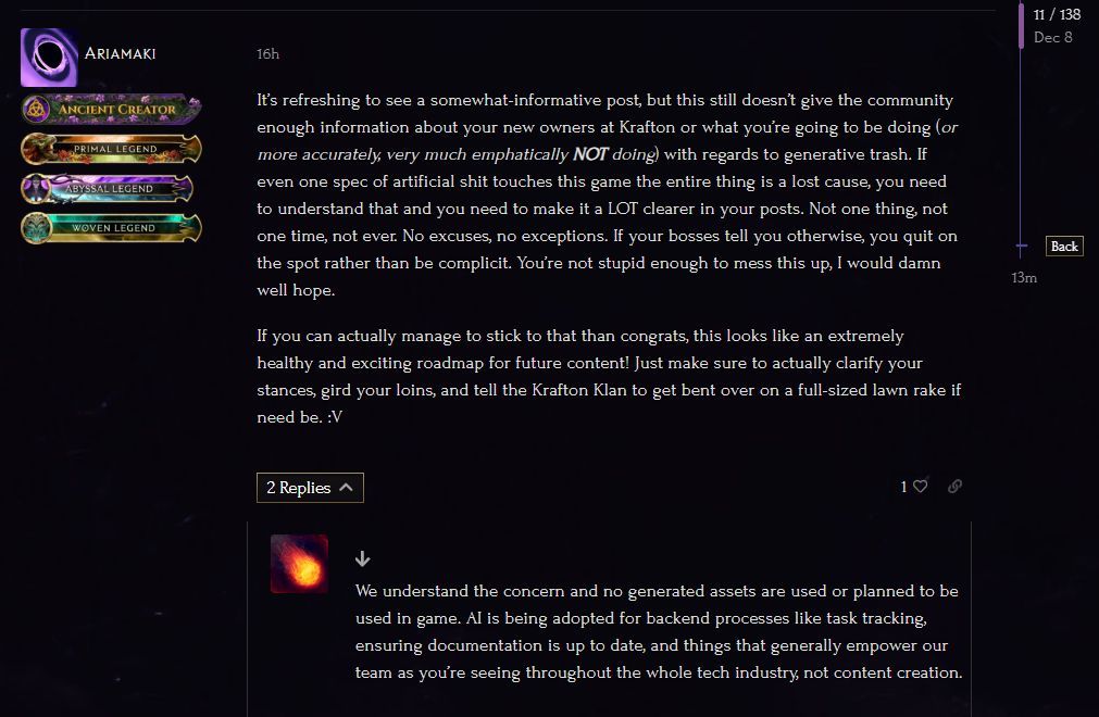 Even though the post about the future of Last Epoch didn't mention AI, players in the comments were hoping the studio would give a clear statement on it. People are worried because Krafton, a company that focuses on AI, is taking over the team. The creators say they are not using AI in the game's development and don't plan to in the future. Right now, these solutions are used solely for quest tracking, updating documentation, and providing general assistance to the team.