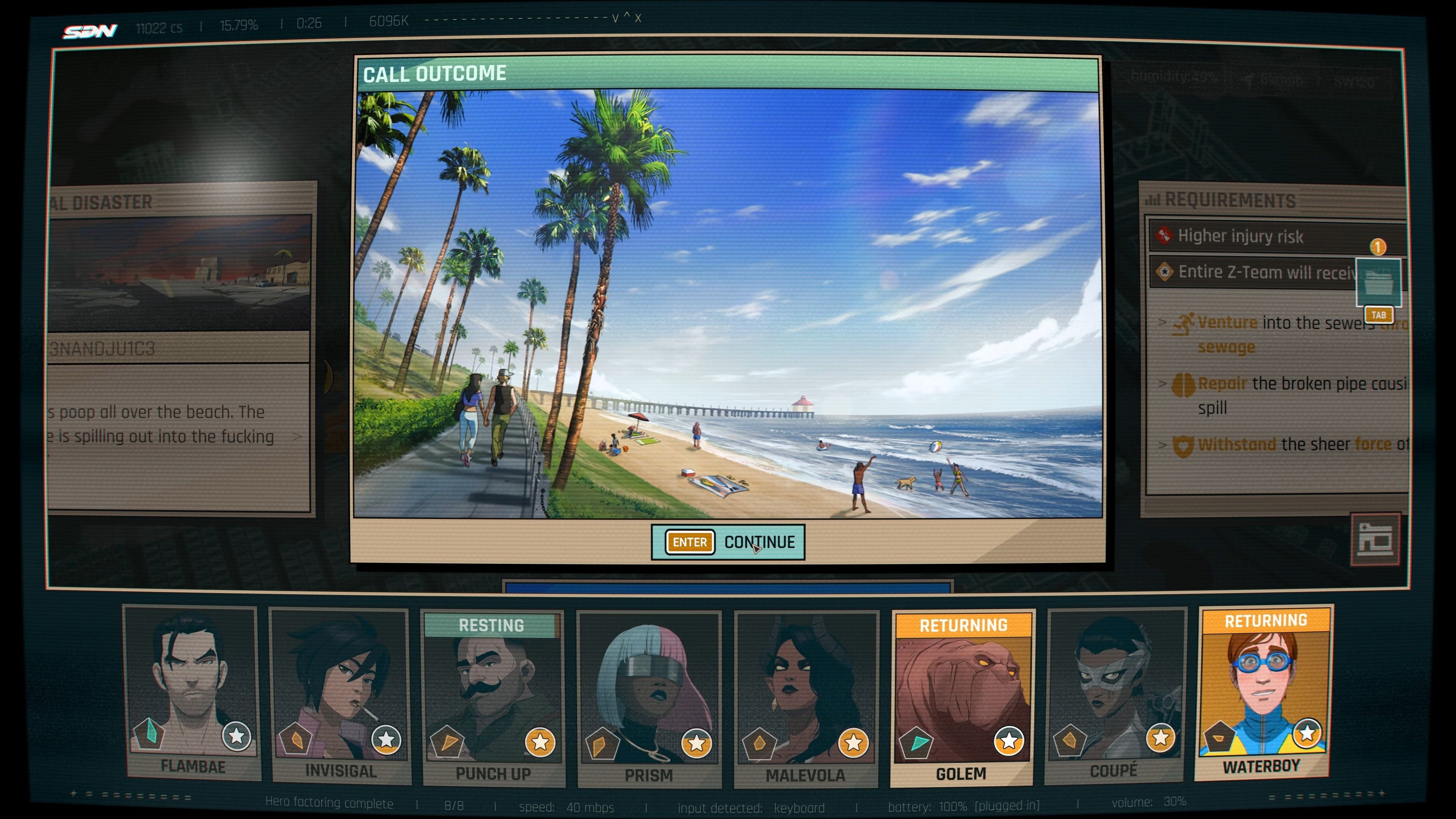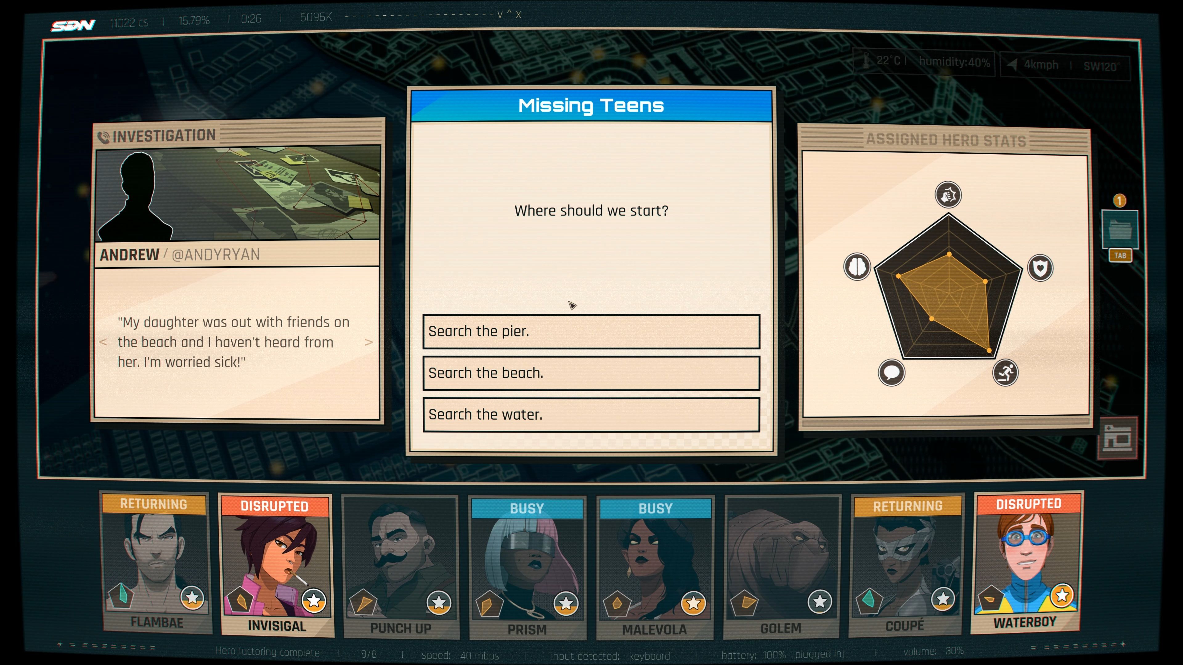 It seems that there is no time limit to start hacking. So, my hint is to wait between phases / minigames for the team to go back and rest. Each part of the city unlocks different investigations. We describe them from left to right.