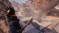 After reaching the ruins, defeat the bear-like enemies or run past them and head inside. Be careful to not get hit by the blue electric orbs shot from the walls. Further in, you will encounter a pool of lava that you can use your grappling hook to get across.