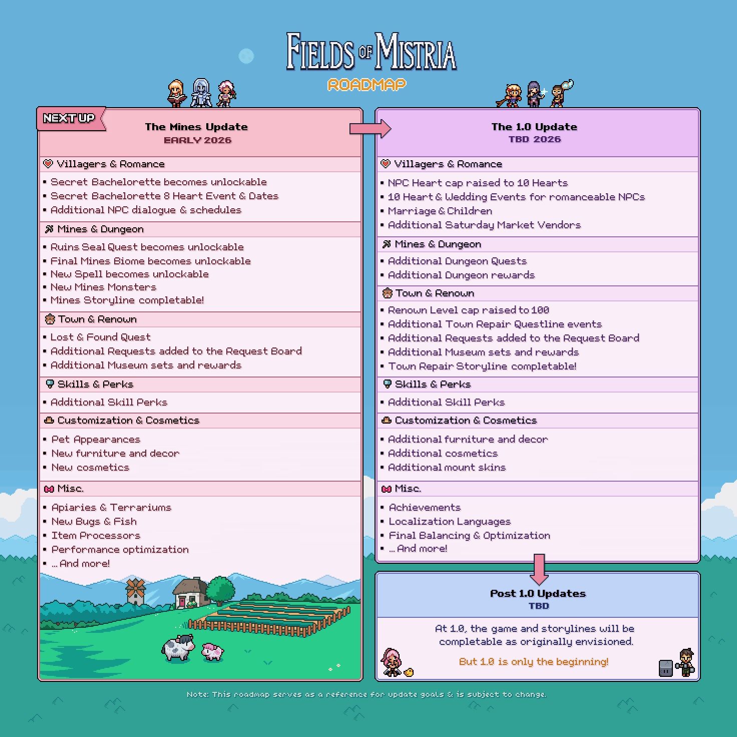 There will be a lot happening for Fields of Mistria in 2026. Here you will find the roadmap as well as learn more about 1.0 release and what's coming to the game after that.