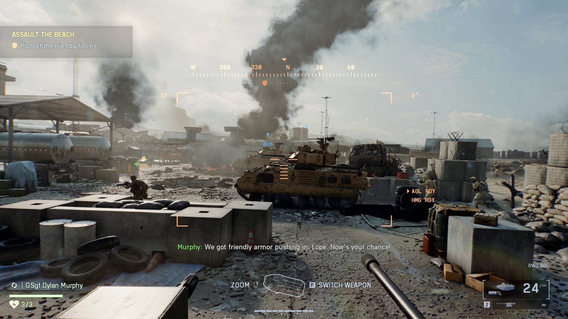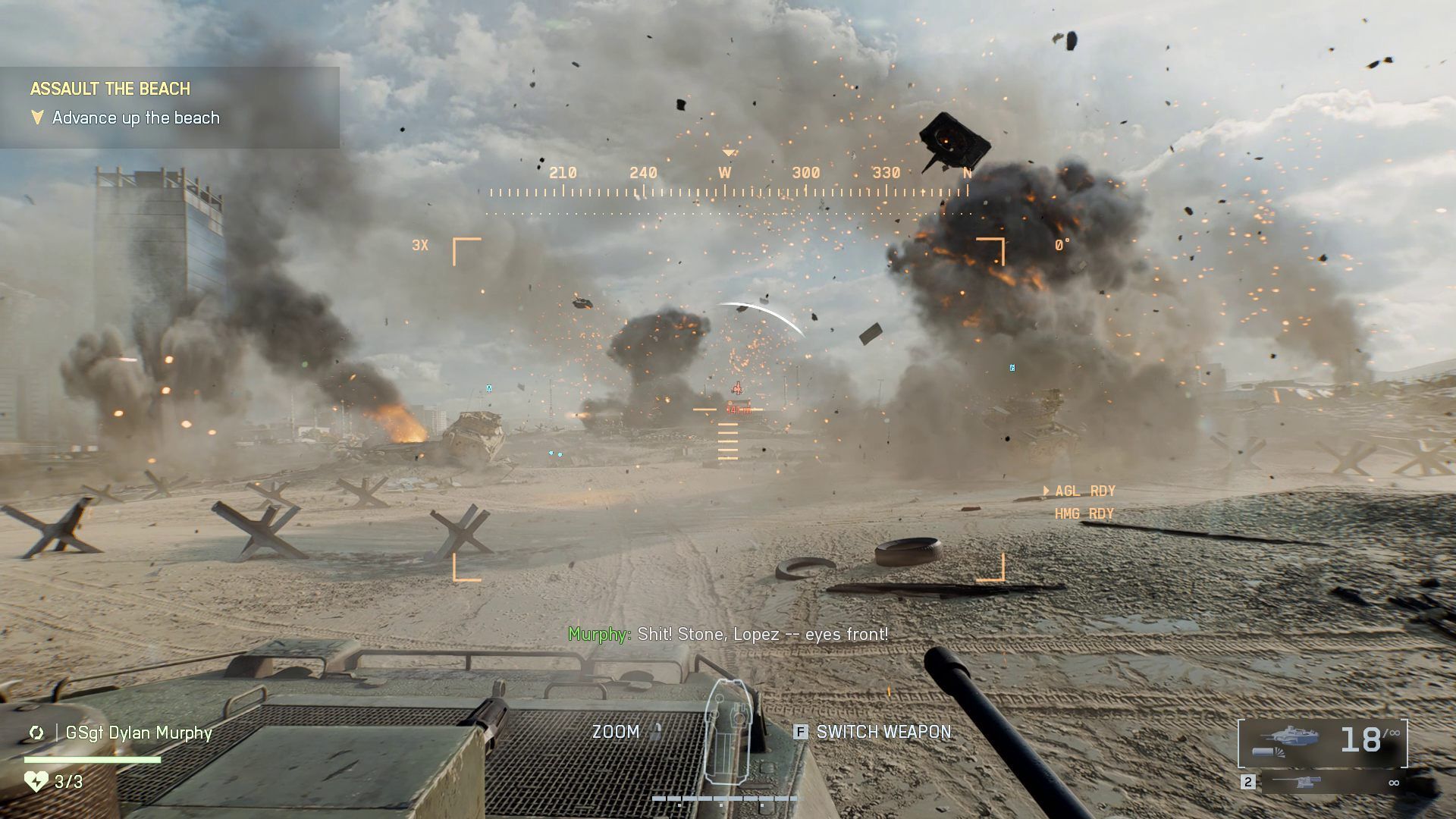 In the third mission, set in Gibraltar, which I have dubbed "We Have D-Day at Home," we find ourselves as Murphy in an amphibious vehicle heading towards the shore. On the way, we observe an entire army of allied machines heading to battle, and on the shore, enemy fortifications await, which we shell with a cannon. Unfortunately, we cannot control the vehicle. There's a lot going on here, but I jokingly gave this stage its name for a reason. For me, it didn't make an impression; I didn't feel that it was something new in the series. I think the biggest problem stems from the fact that Battlefield has accustomed us to massive chaos, so I was expecting a larger-scale battle. Meanwhile, over here, we only see a handful of vehicles on the ground, and sometimes something flies by in the sky. What makes sense is that, like a "modern battlefield," you don't have a massive army of foot soldiers here, just a few bigger groups.