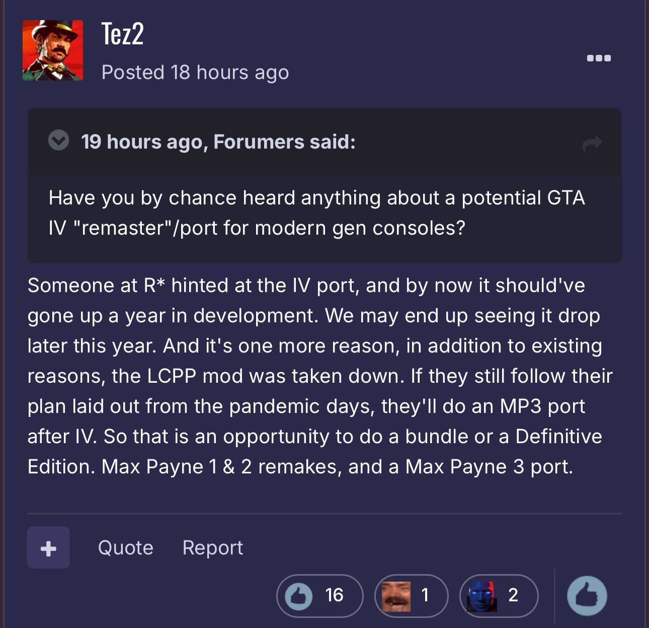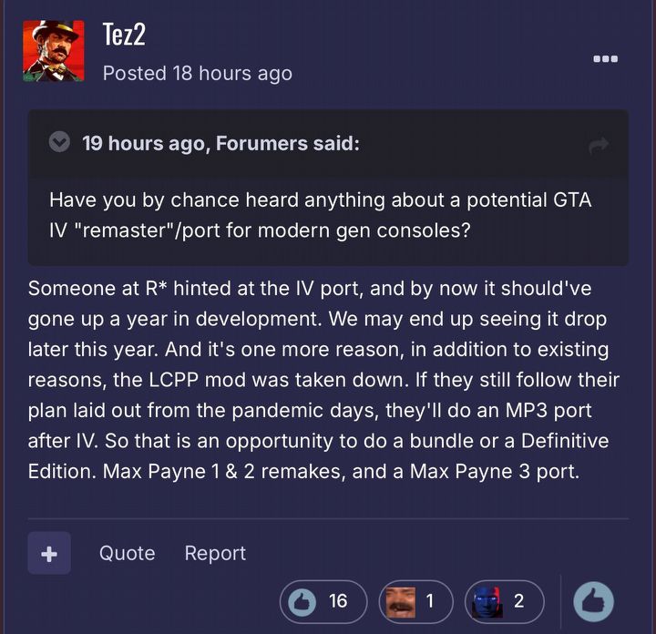 What’s more, Tez2 says Rockstar’s plan was to drop a Max Payne 3 remake not long after the GTA 4 port goes live. That would line up pretty well with the already announced remakes of the first two games, and according to him, a full trilogy release isn’t off the table either. Pretty interesting. At this point, who knows? After all, it's still just a rumor.