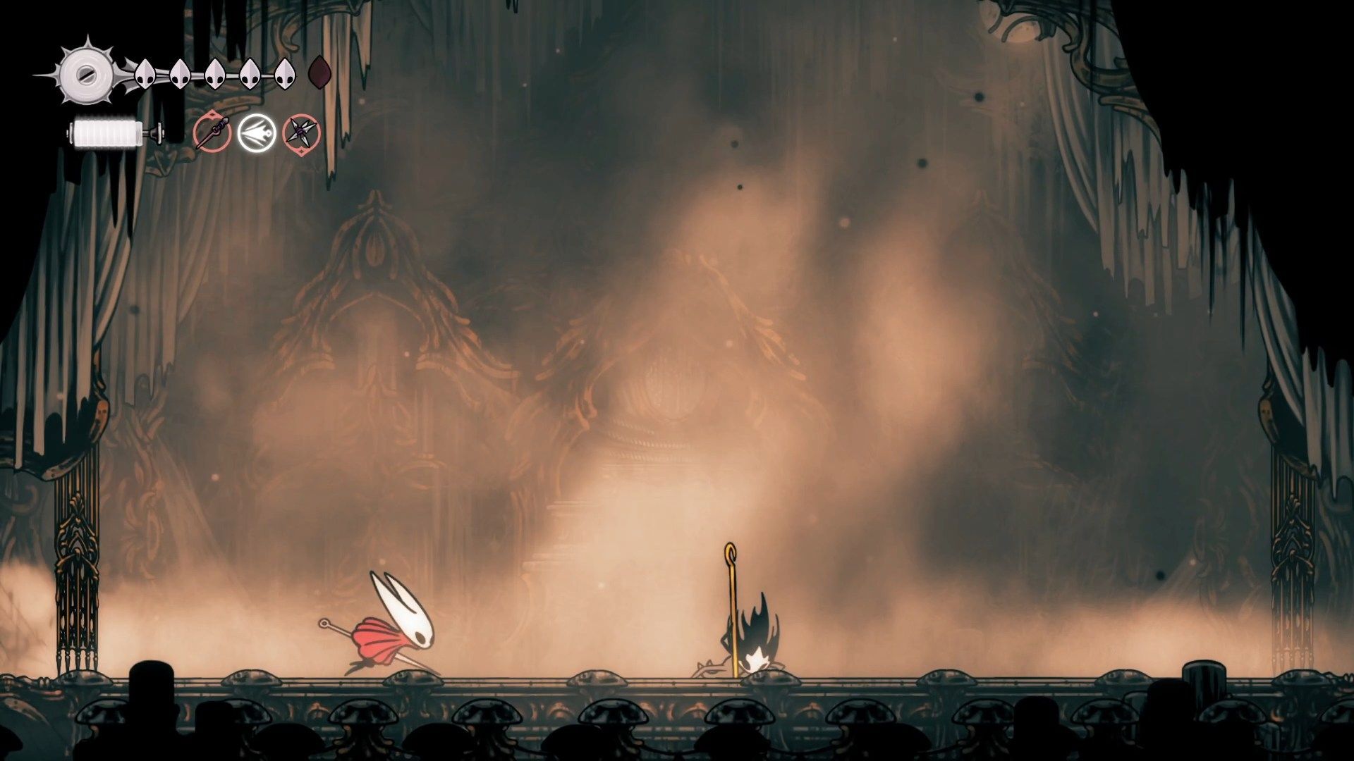 Phantom is the hidden final boss of act one in Hollow Knight: Silksong. It is a very aggressive enemy that requires the player to move constantly.