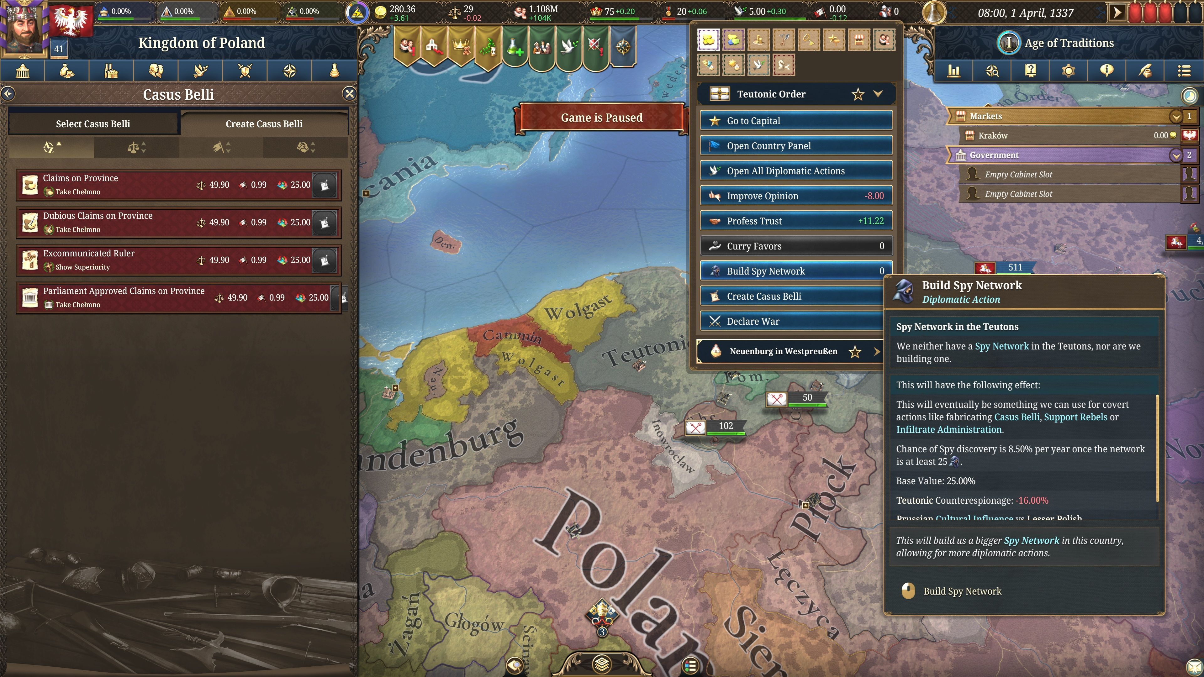 There is also another method of creating Casus Belli, which involves Spies. All you have to do is send spies to the country with which you want to have Casus Belli. When the Spy Network reaches 20 points, you will be able to create a specific Casus Belli (just right-click the hostile country), such as Anti-Piracy War or Religious War.
