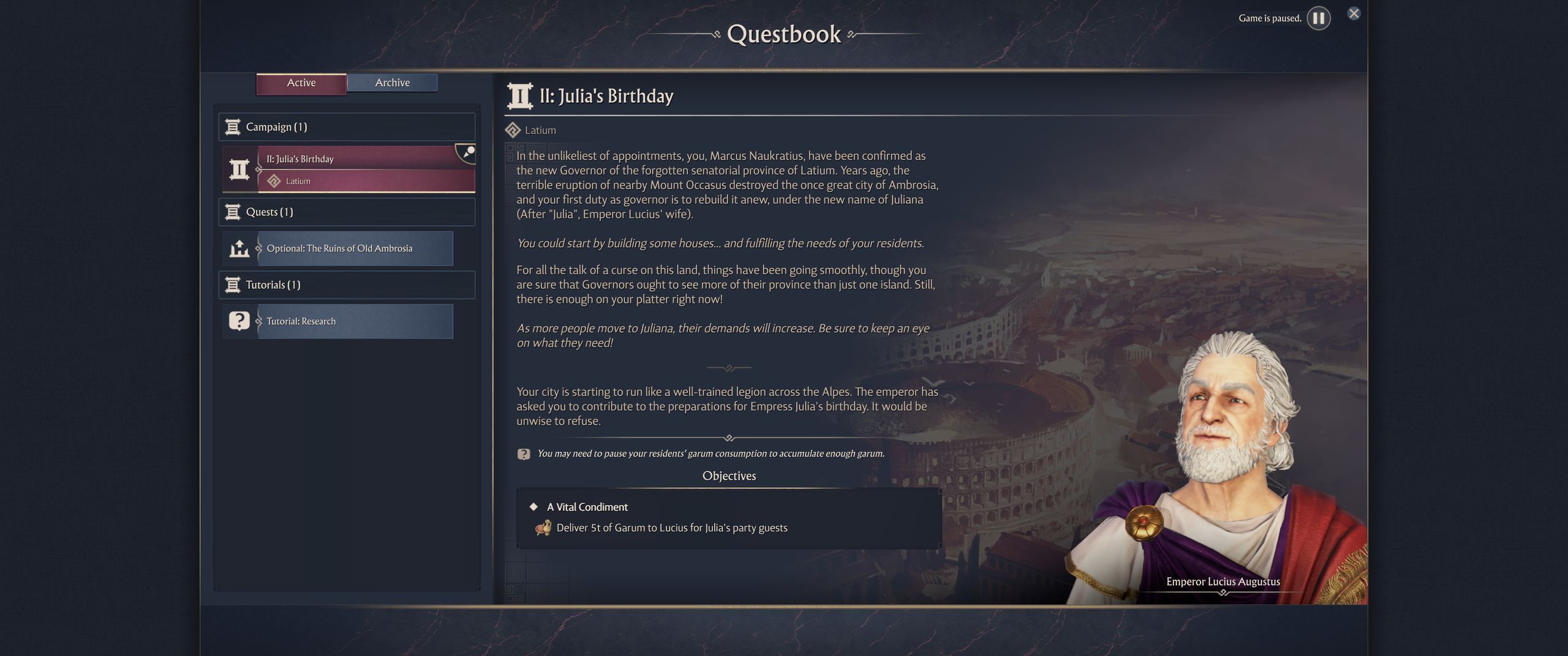 Some tasks in Anno 117 will require you to gather a significant amount of a specific good. This can be problematic because most goods are continuously consumed by your population, making it very difficult to store and accumulate the necessary supplies. However, there is a way to effectively store goods without significantly increasing production. In this text, we have described how to halt the consumption of goods and deliver garum to the emperor.