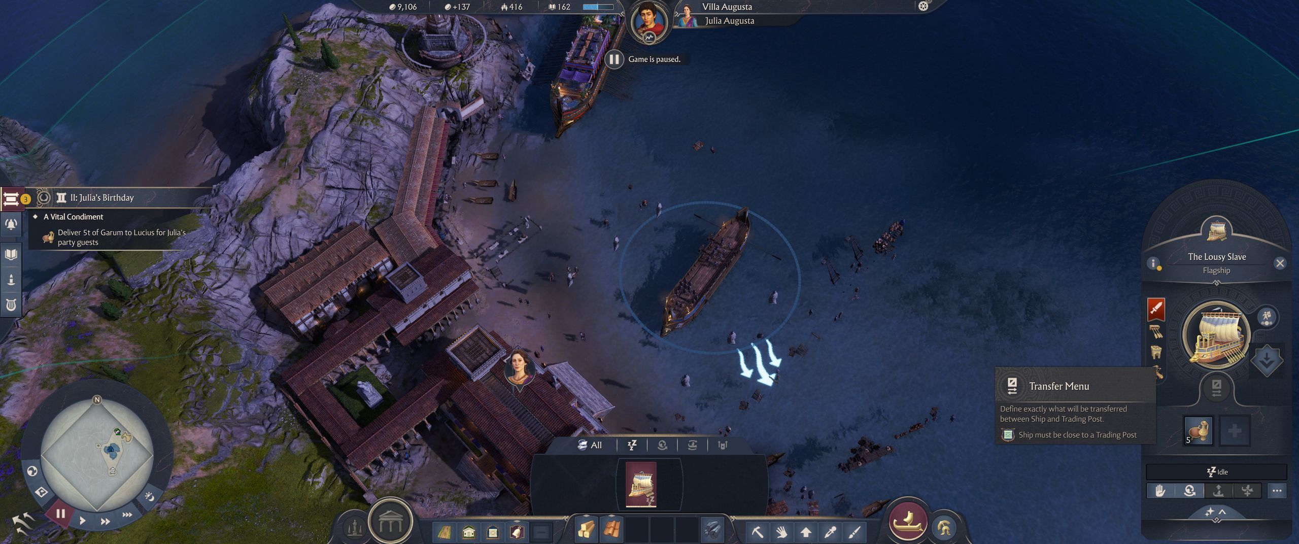 Once you have collected five tons of garum, you need to load it onto your flagship. Position the ship at your trading post, enter the ship's menu, and select the transfer menu. Transfer five tons (or five units) of garum onto the ship and sail to Villa Augusta. Upon arrival, interact with the imperial palace to deliver the garum and complete the task.