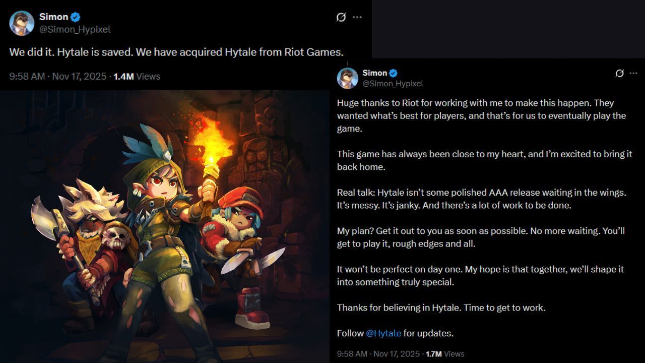 Hytale has been saved. That is the message Simon, the founder of Hypixel Studios, shared today. Hypixel was originally a popular Minecraft server, but in 2018, with support from Riot Games, Hypixel Studios began working on Hytale, a sandbox RPG with clear Minecraft influences. However, the development did not go smoothly, and Hytale was ultimately cancelled this past June. By August, Simon reportedly entered talks with Riot Games to buy back the rights to Hytale so development could continue. Today, on social media, Simon has shared that they have successfully “acquired Hytale from Riot Games.”