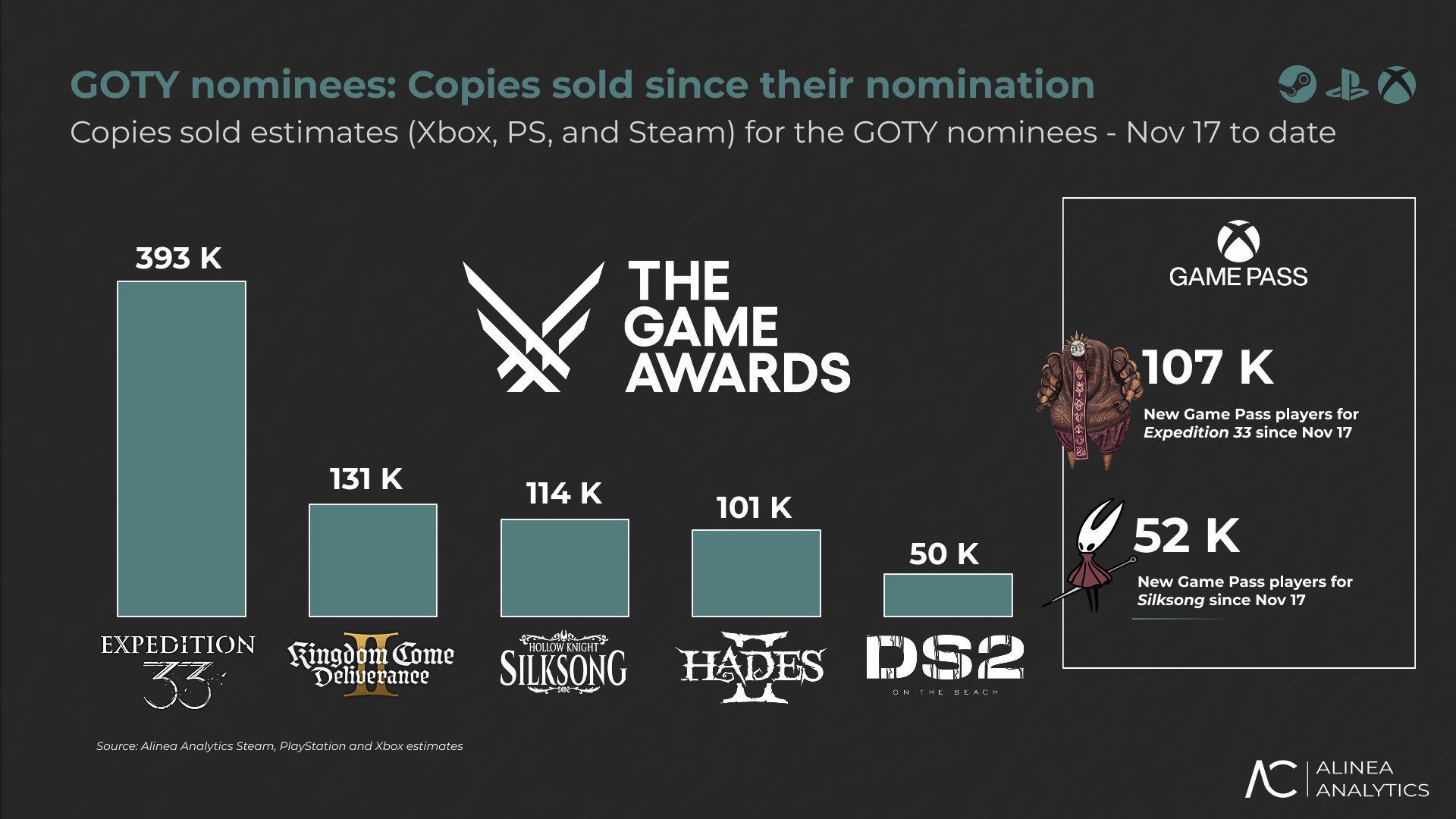 Estimated number of copies sold since the announcement of the nominations for The Game Awards 2025. Alinea Analytics