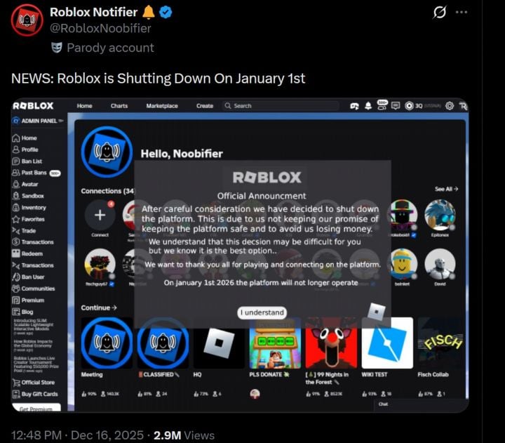 The last time Roblox was “supposed” to shut down on September 1, it was the exact same situation as now. The claim came from a parody account on X called Roblox Notifier, which clearly states that it’s satirical. So if this latest rumor had you worried, there’s really no reason to be. Roblox isn’t shutting down on January 1, or anytime soon. That odd notification alone should be enough to make you realize it’s fake.
