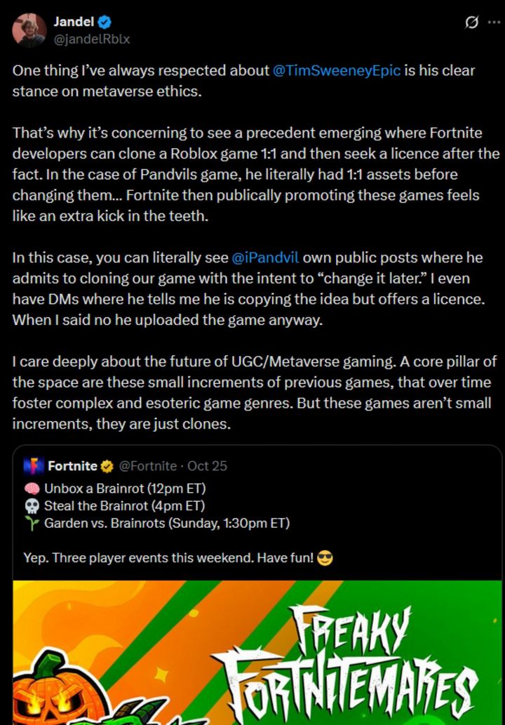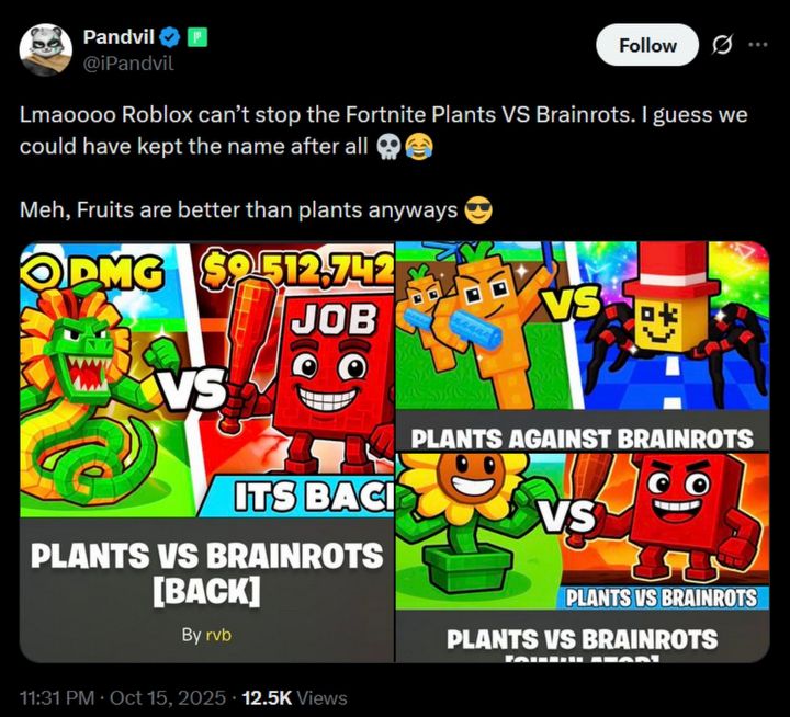 On October 15, the day his Plants vs Brainrots launched on Fortnite, Pandvil shared a pretty mocking post about the whole situation with the Roblox’s version.