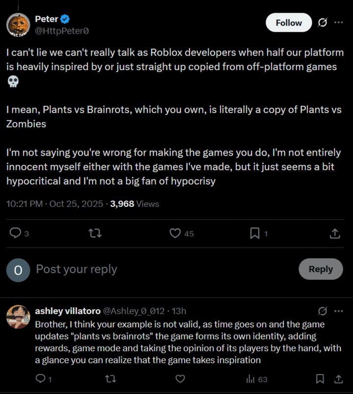 Roblox’s Plants vs Brainrots is, of course, inspired by the 2009 hit Plants vs Zombies, a hugely popular tower-defense game that spawned tons of sequels, spin-offs, and adaptations. You could say Jandel’s Plants vs Brainrots is another take on that formula. There’s already a discussion under Jandel’s post about whether his game counts as a fresh adaptation with its own identity, or just a Plants vs Zombies copy.