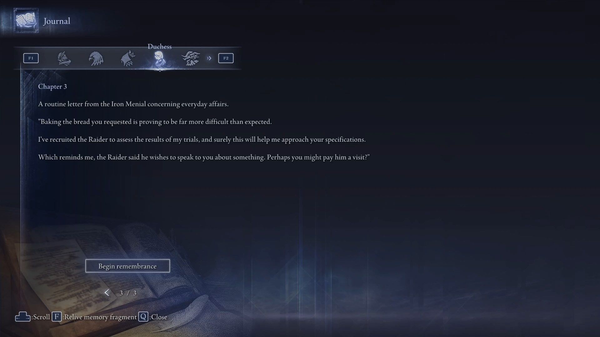 Remembrances are side quests assigned to each of the playable characters. Playing a given character gradually unlocks entries in his or her personal journey. Some entries are related to Remembrances - you might get a message in the bottom right corner of the screen when you come back from an expedition to let you know they're available. When the Remembrance becomes available, you can activate it in the journal in the Roundtable Hold. Occasionally, other playable characters also appear in some Remembrances. So, make sure to unlock the initially unavailable characters - Duchess and Revenant, as soon as possible, to address potential issues with obtaining Remembrances. For example, in the first Remembrance, Duchess will have to talk to Revenant, so the memory will be unavailable until you unlock Revenant.