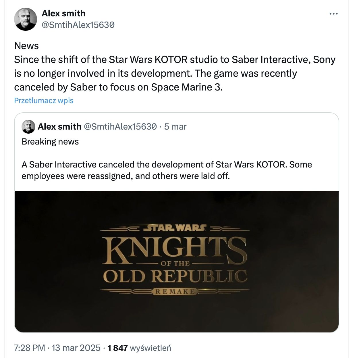 A few days ago, a rumor started circulating on the internet about the alleged cancellation of KotOR. Its author was Alex Smith - a former developer at Bend Studios and co-creator of the Syphon Filter series, who doesn't have a very good reputation as an industry insider. Moreover, during the announcement of Space Marine 3, Smith took the opportunity to "substantiate" his rumor, writing that Saber studio wants to fully focus on the new title.