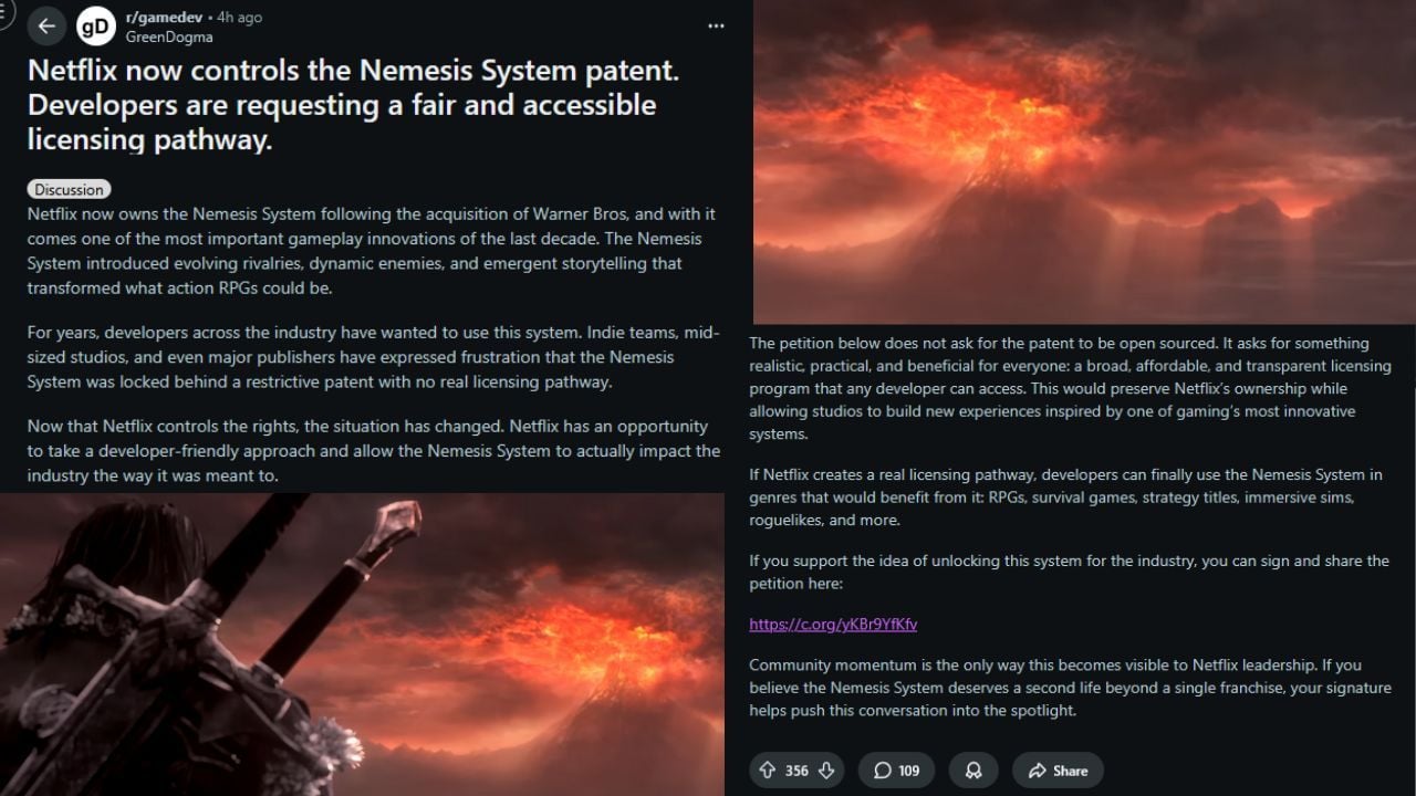 The petition was shared on Reddit via the GameDev subreddit. The post is a lengthy appeal to video game fans to encourage Netflix to “take a developer-friendly approach and allow the Nemesis System to actually impact the industry the way it was meant to.” The post claims that “for years, developers across the industry have wanted to use this system.” But Warner Bros.' patent on the Nemesis System has left many development teams unable to take advantage of it.