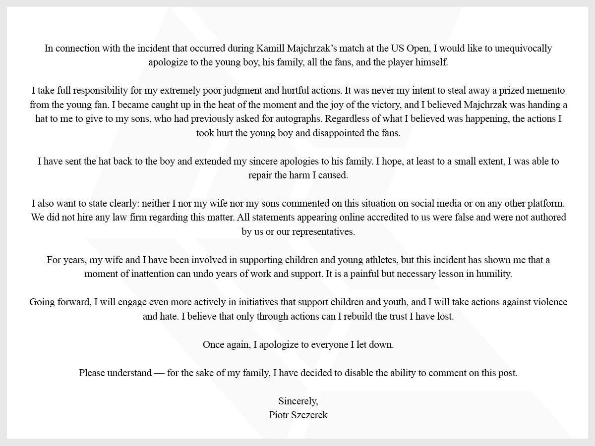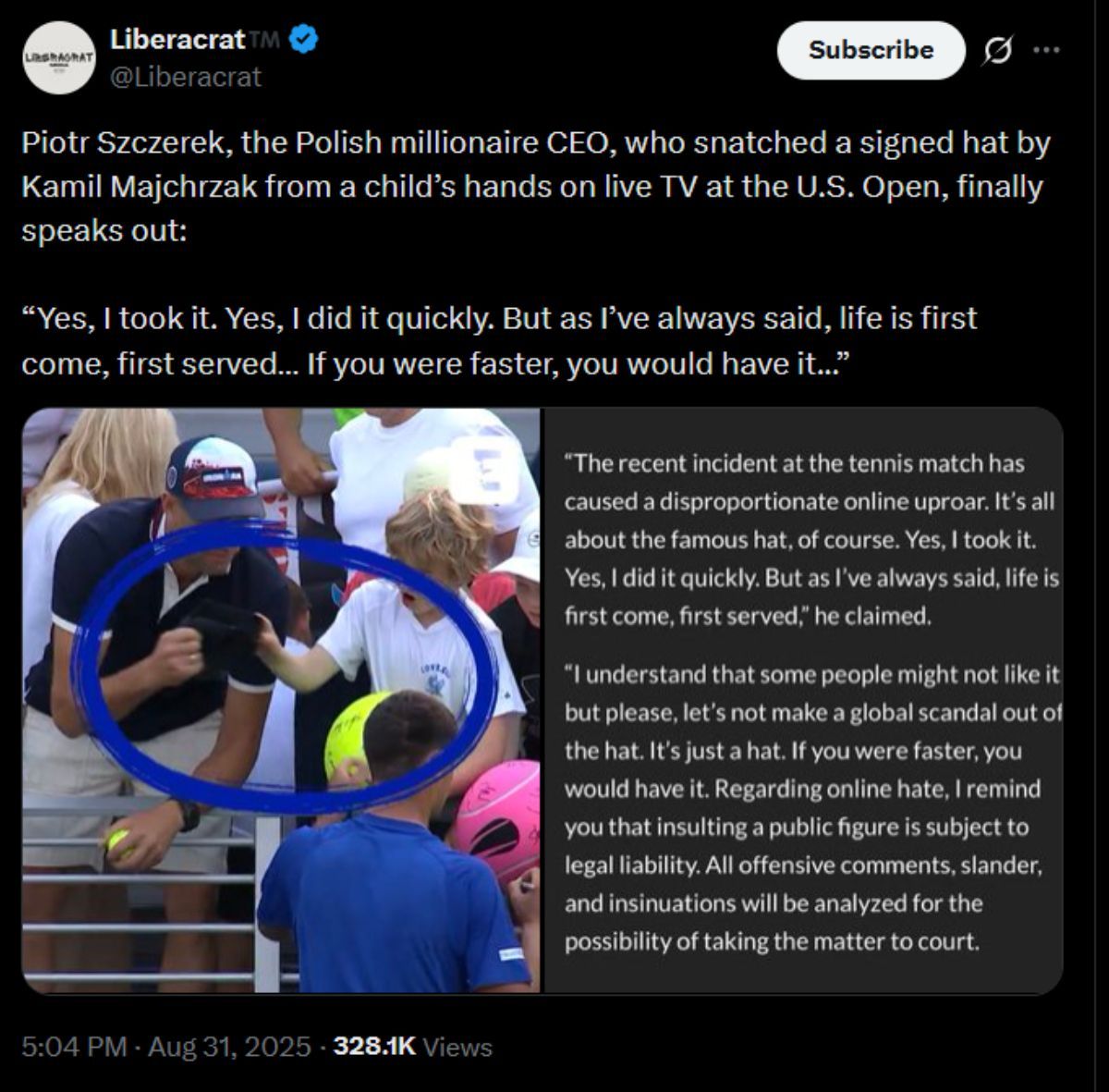 At the 2025 US Open, Polish tennis player Kamil Majchrzak had just won a match and was signing autographs. He attempted to give his signed cap to a young fan named Brock. At that moment, Piotr Szczerek, a millionaire CEO of the paving company Drogbruk, swept in and took the cap, placing it in his wife's bag.