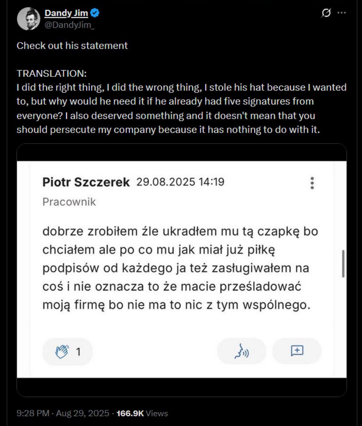 Today, September 1st, Szczerek posted on Facebook to apologize for his actions. He acknowledged his poor judgment, said he acted in the heat of the moment believing the hat was meant for his sons, and emphasized that it was never his intention to hurt the child.