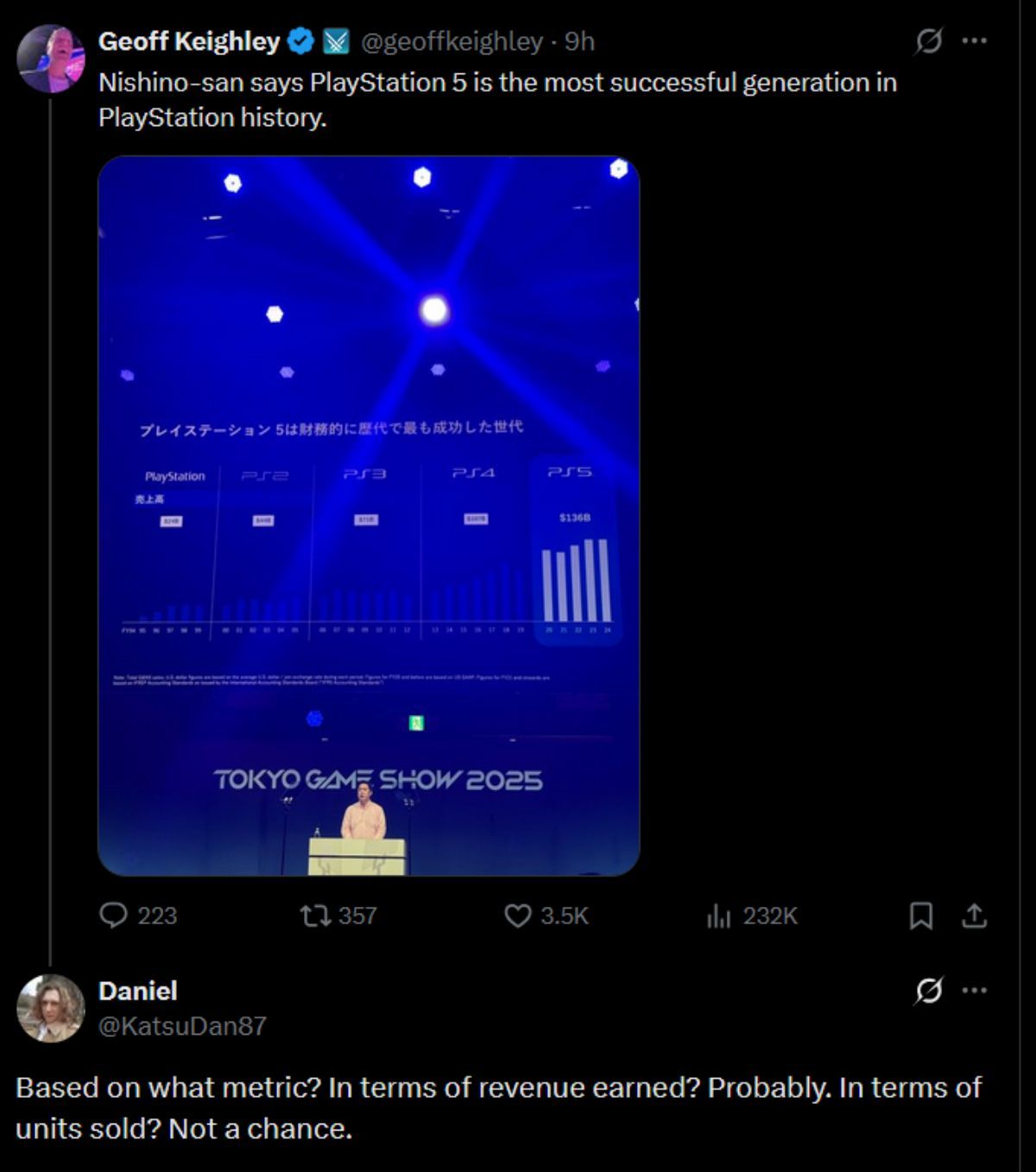 Geoff Keighley shared on X today that Sony’s CEO, Hideaki Nishino, is boasting about the PS5’s achievements compared to previous generations. Personally, and judging by the comments under the post, I think others agree there are reasons behind that success they’d probably rather not admit.